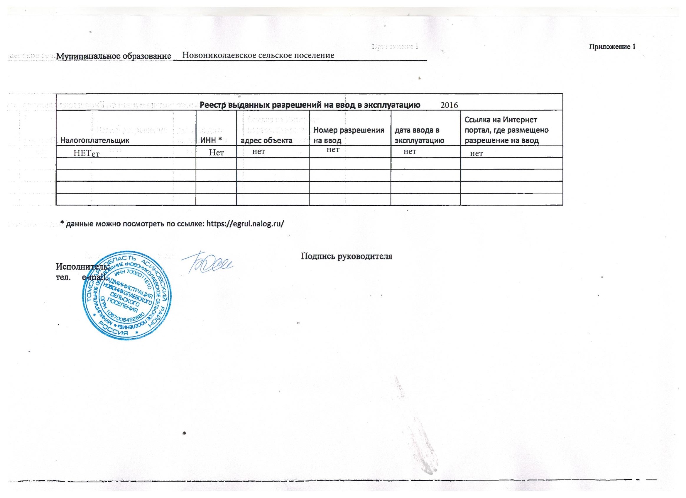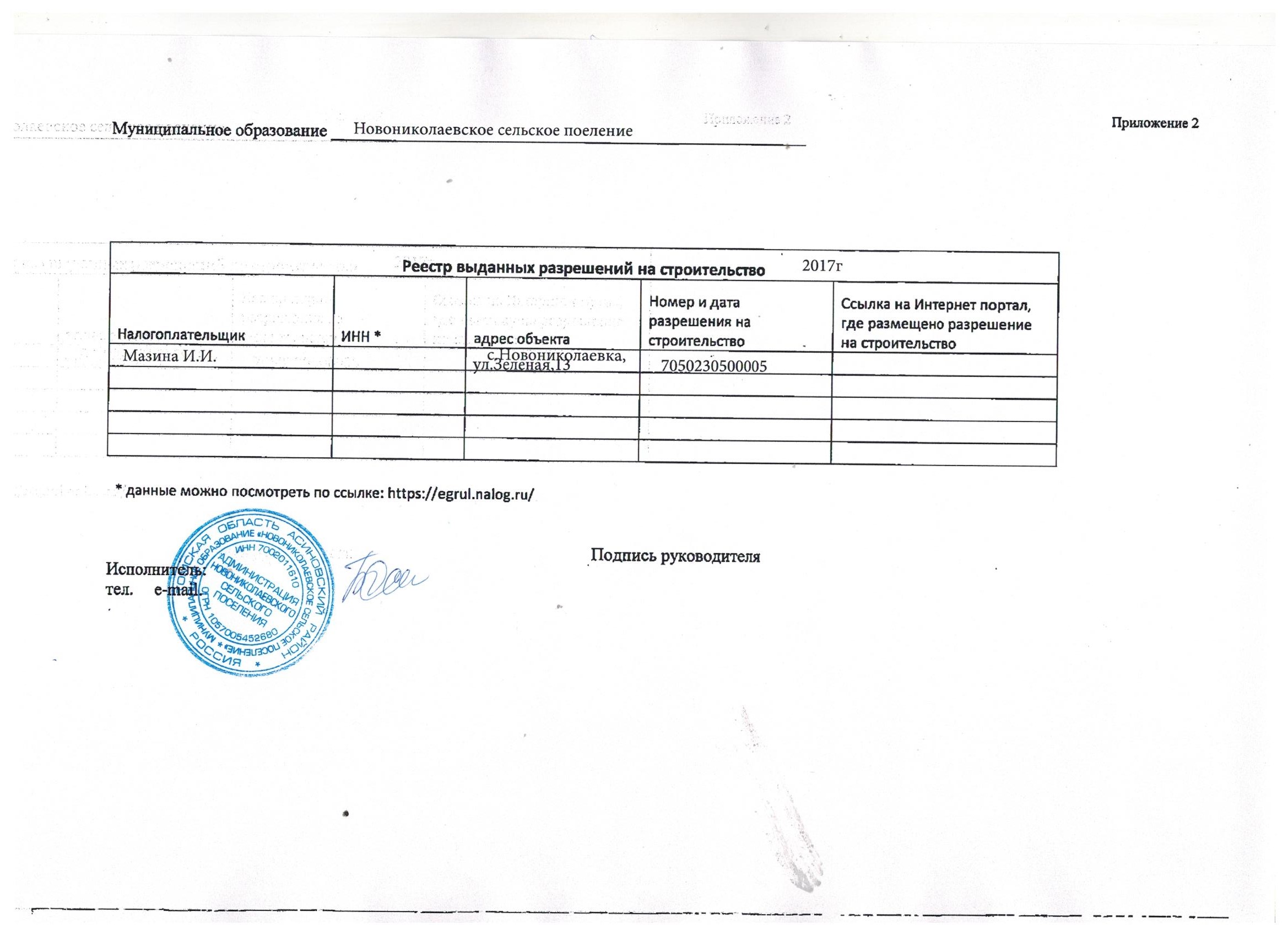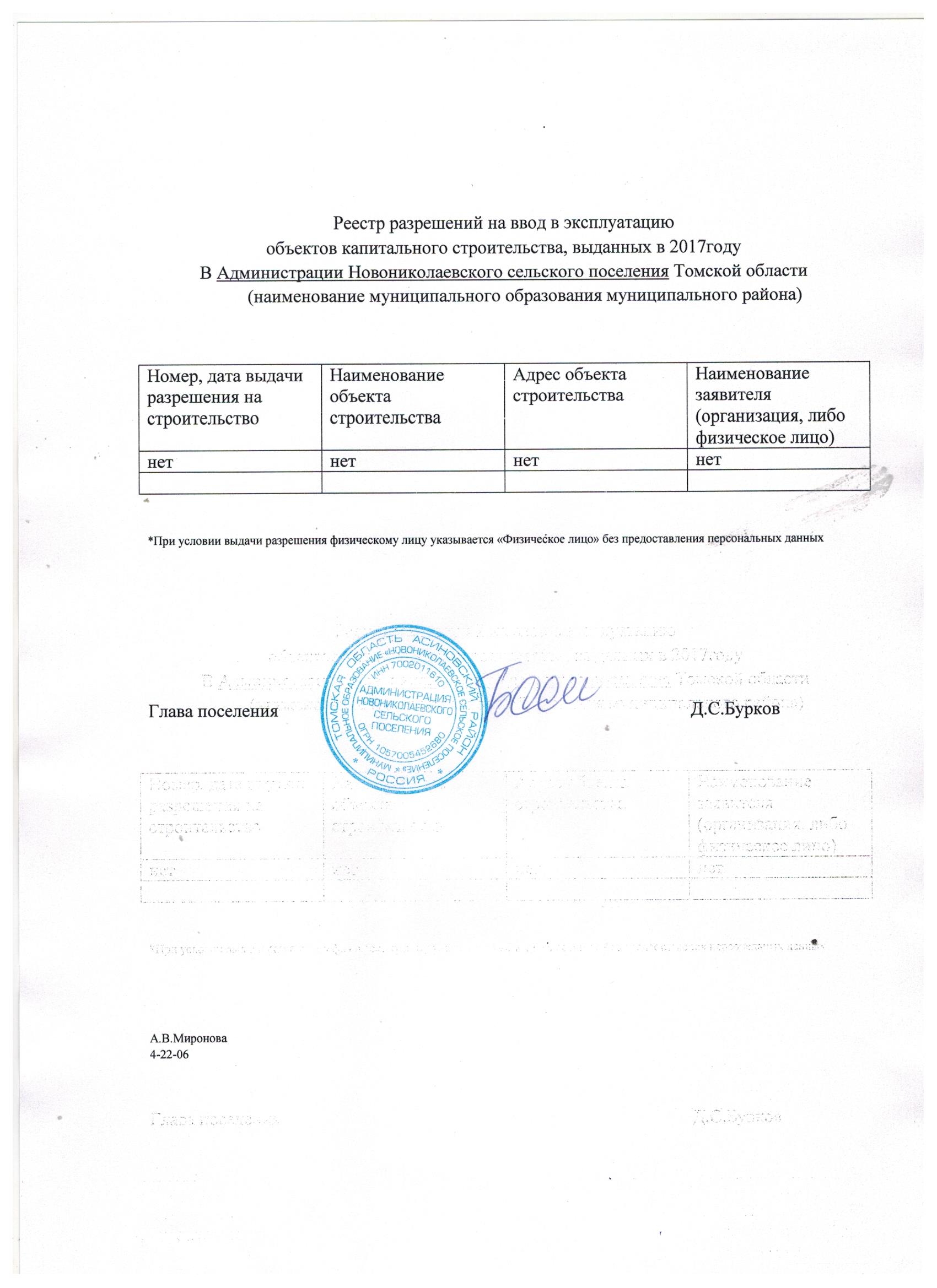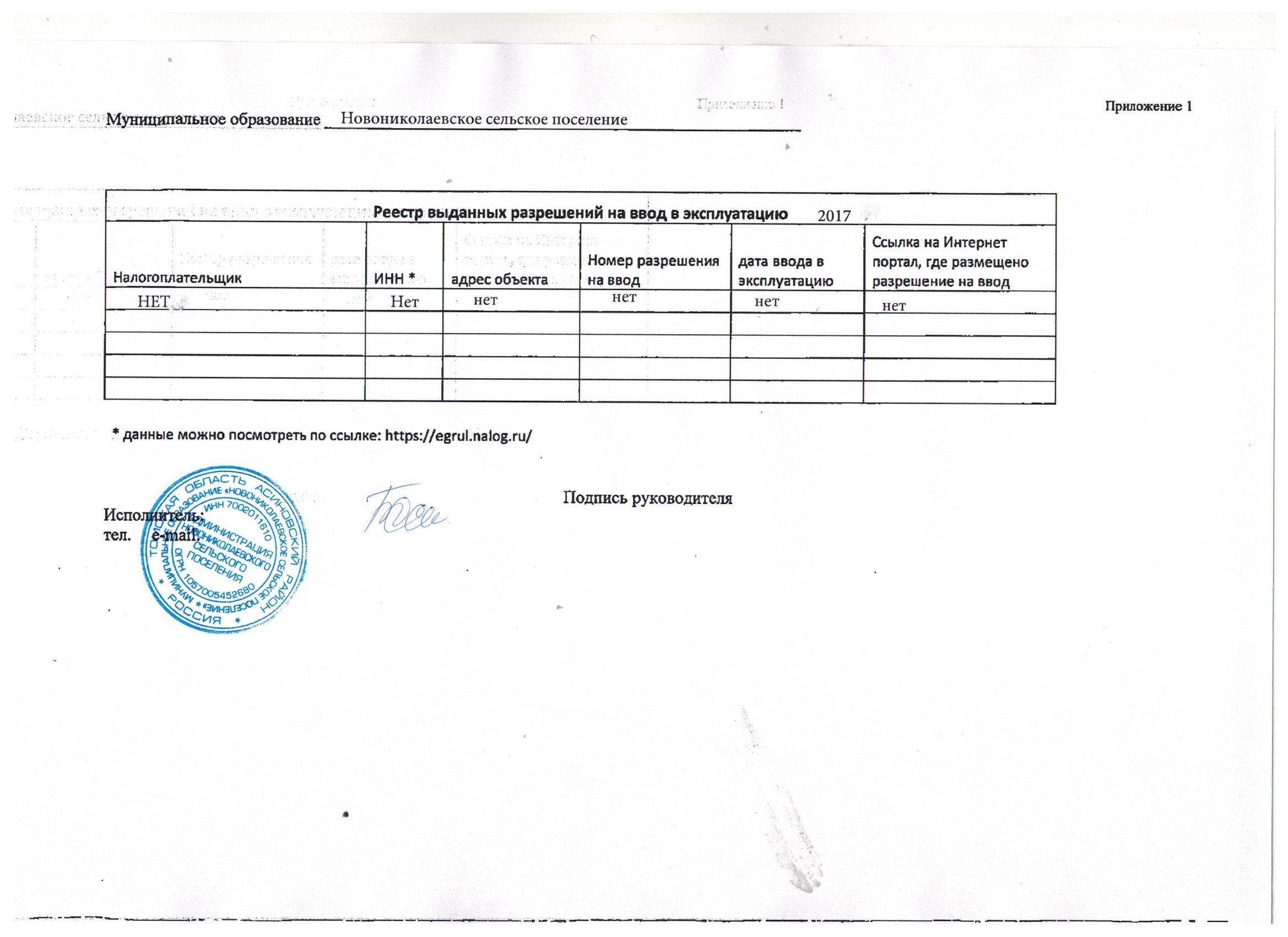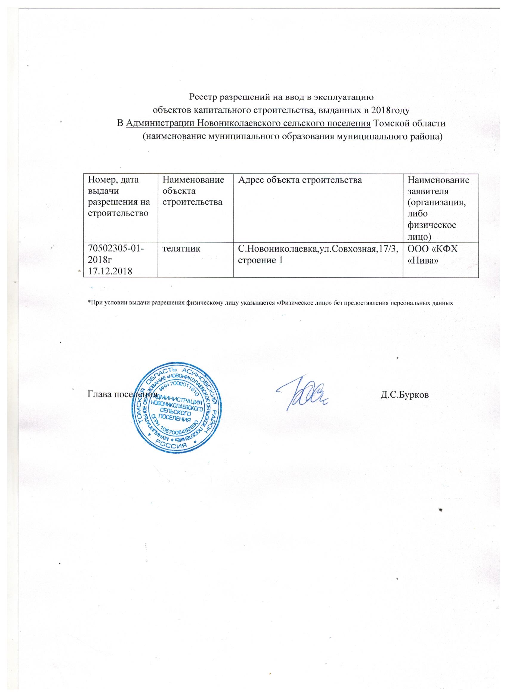 Реестр разрешений на ввод в эксплуатацию объектов капитального строительства, выданных в 2017 году в Администрации Новониколаевского сельского поселения Томской области (jpeg, 258 kb)
