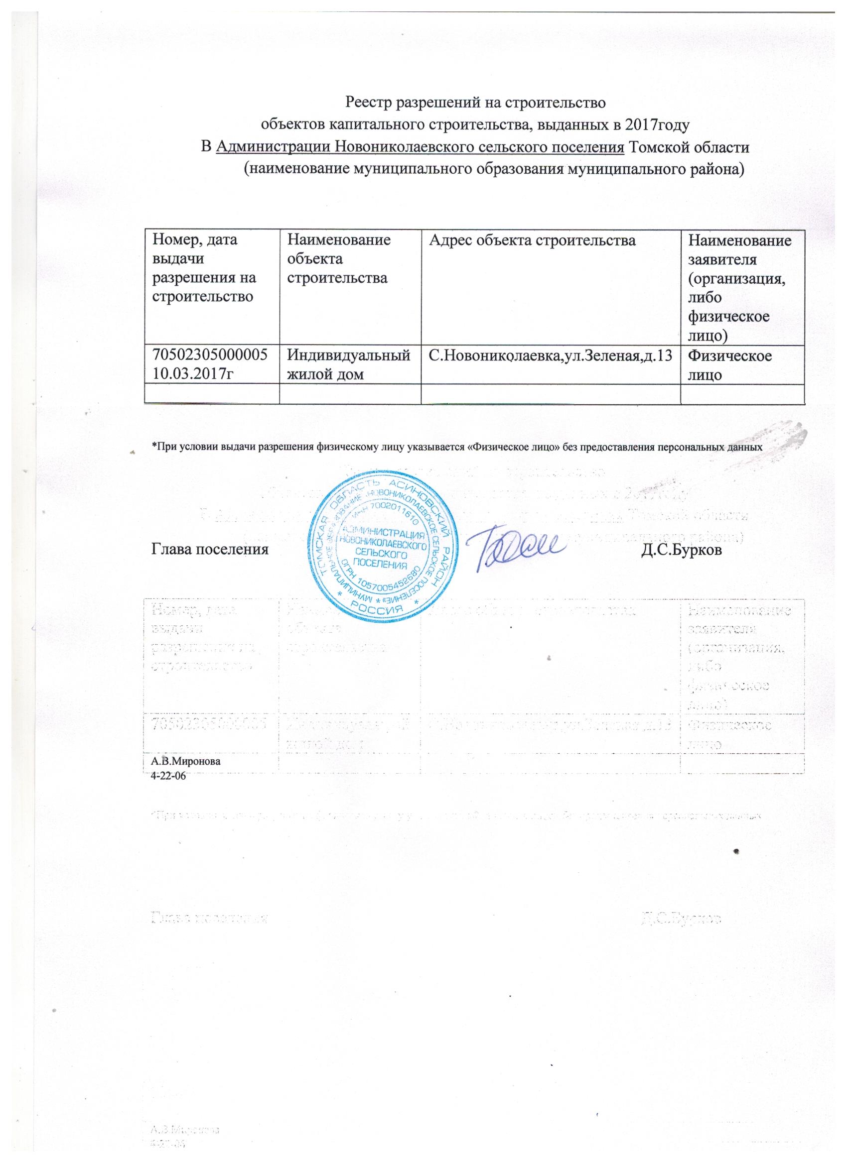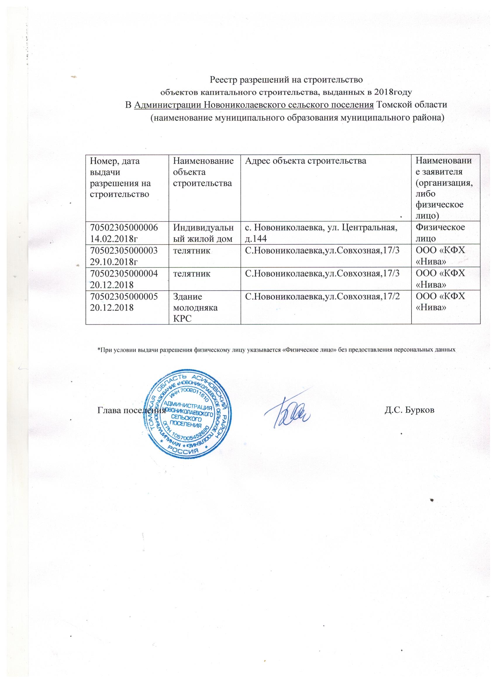Реестр разрешений на строительство объектов капитального строительства, выданных в 2017 году в Администрации Новониколаевского сельского поселения Томской области (jpeg, 280 kb)